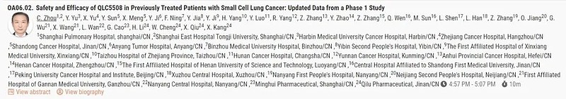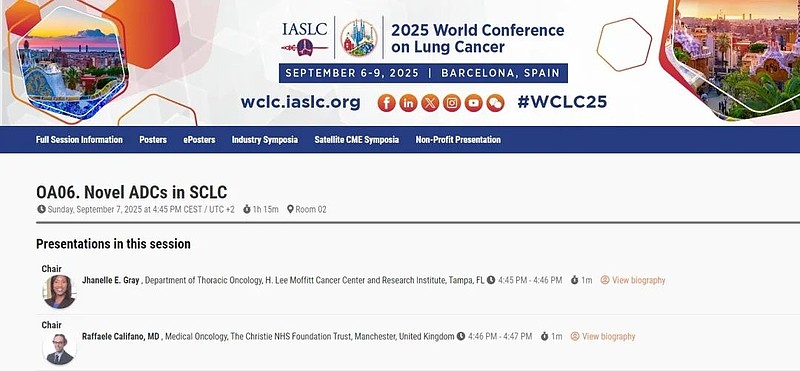 国际肺癌研究协会(IASLC)理事会2025-2027届主席、同济大学附属东方医院周彩存教授将于巴塞罗那当地时间9月7日下午在“小细胞肺癌ADC新药 ”专场进行口头报告。